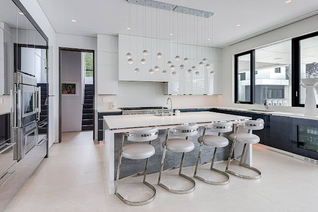 It has a two-story foyer and separate stair hall with floating steel vertebrae staircase, an elevator, formal living and dining rooms, European-inspired chef's kitchen, open concept dining area and family room with fireplace and glass-enclosed wine display, home office, home gym, three laundry rooms, two garages, and much more. Outdoor features include a gated entrance, a motor court, covered and open patios, rooftop terraces, rooftop deck with 10'x10' spa, BBQ kitchen and bar, a six-hole putting green, a heated swimming pool and separate spa, and a pool house with kitchen and outdoor bar, massage and steam rooms, and a second level bedroom and full bathroom.