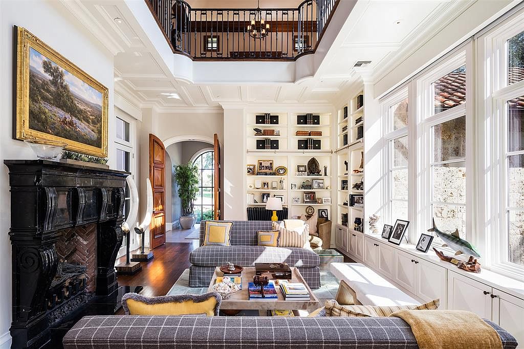 The finely crafted residence features approximately 16,425 square feet of living space with six bedrooms, seven full and four half bathrooms, foyer and separate stair hall with floating spiral staircase, an elevator, formal living and dining rooms with fireplaces, a butler's pantry, an eat-in gourmet kitchen and separate catering kitchen, a family room with fireplace, home office with custom built-ins, a two-story library with fireplace, game room, an eight-seat media room, wet bar, wine cellar and tasting room, an underground seven-car garage, and much more.